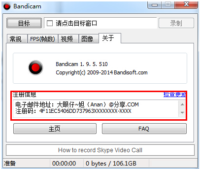 设置方法:打开bandicam,点“关于”,破解注册后下方会有注册信息,否则录制后会有软件logo。