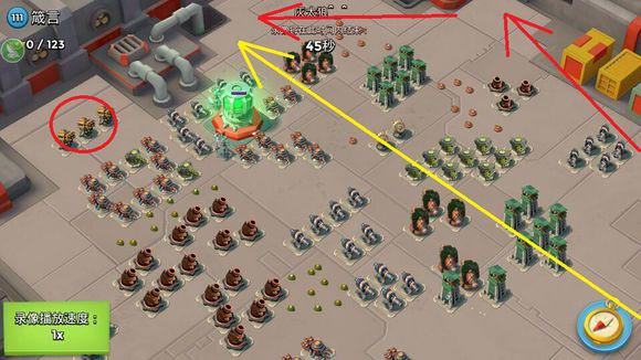 ②引导:纯妹子在引导时,可以利用建筑把妹子卡成两队,更加整齐。再者还可以利用地图中墙的角把妹子挤压成一队,更加的细密紧凑。当妹子直接引导在基地周围准备强行爆本时,纯妹子的引导在基地边站好位置时,可再次原地引导一次(收紧队形防止调皮的妹子出烟雾),然后迅速引导基地(提前让妹子在烟雾中做好战斗姿态)。这样的话妹子在烟雾灭的一瞬间,会直接面对目标基地开火,下图黄色区域,下图浪漫大神瞬间四震出手,这手速绝对单身30年的手速。